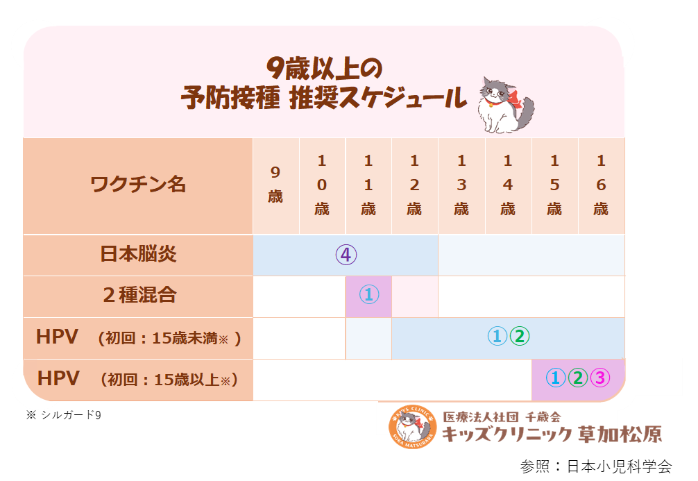 しかし、9歳以降のお子様が対象となるワクチン(日本脳炎2期、二種混合、HPVワクチンなど)は、獲得した免疫を維持・強化するために大変重要な役割を果たします。